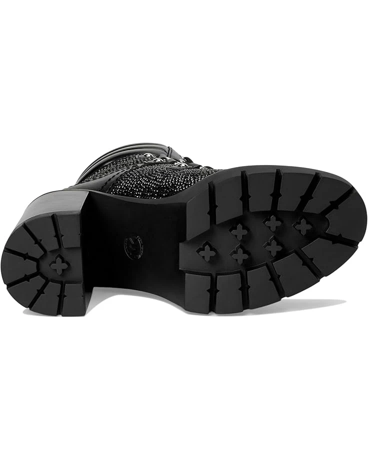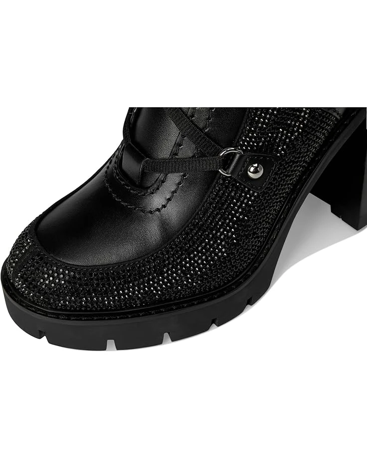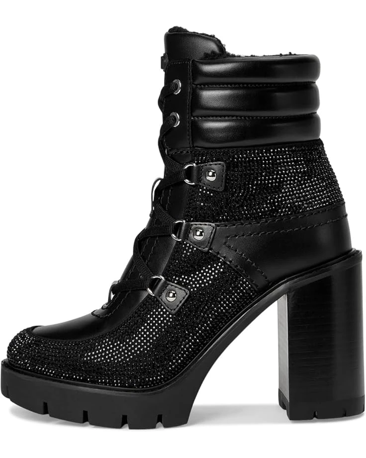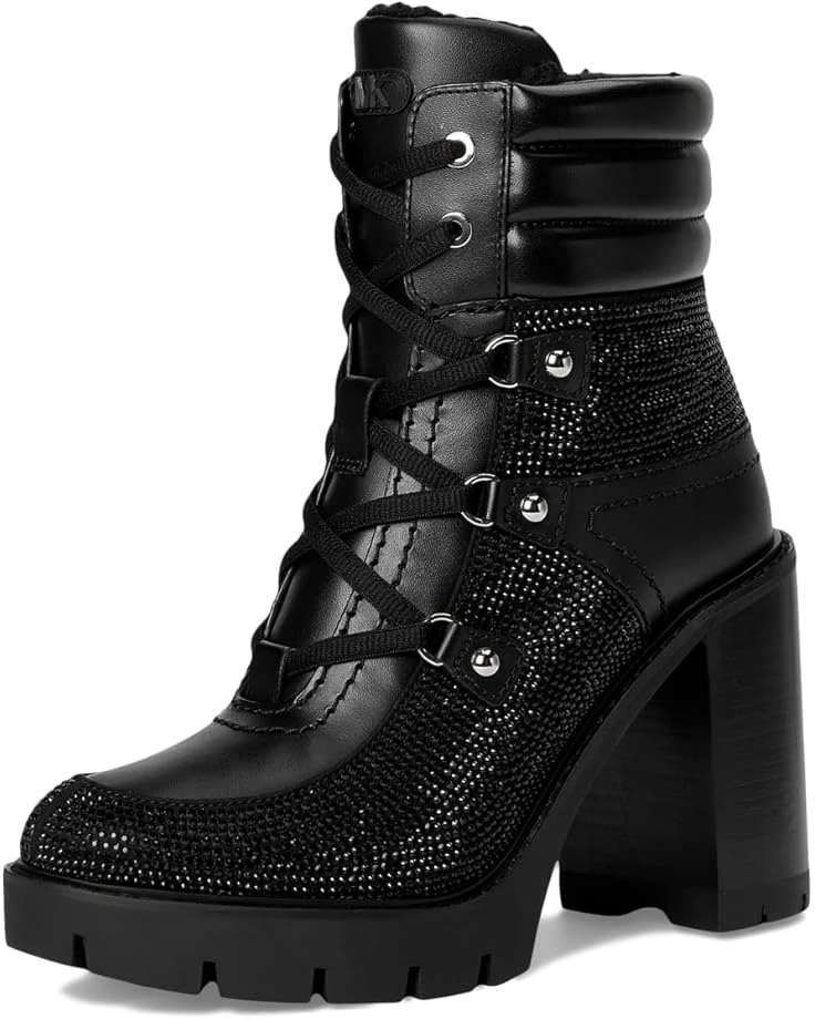 - Modern toe and lug sole construction is featured on this MICHAEL Michael Kors® Asher Heeled Bootie designed to elevate your winter wardrobe with its allover rhinestone glam upper. Boasting a lace-up closure paired with cozy shearling lined shafts that are equal parts practical as fashionable.