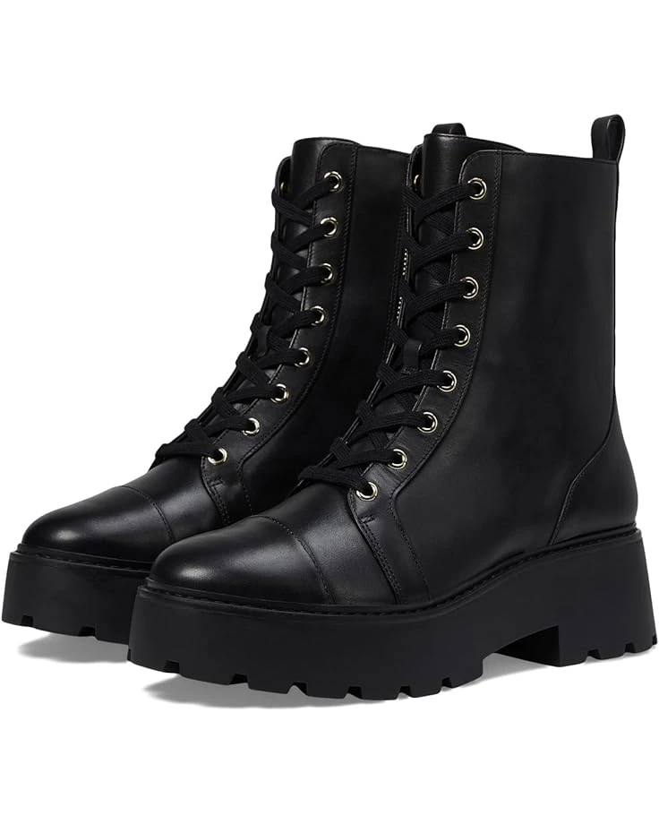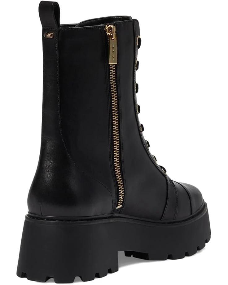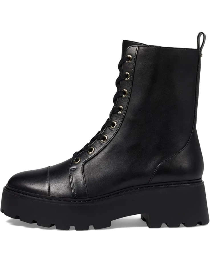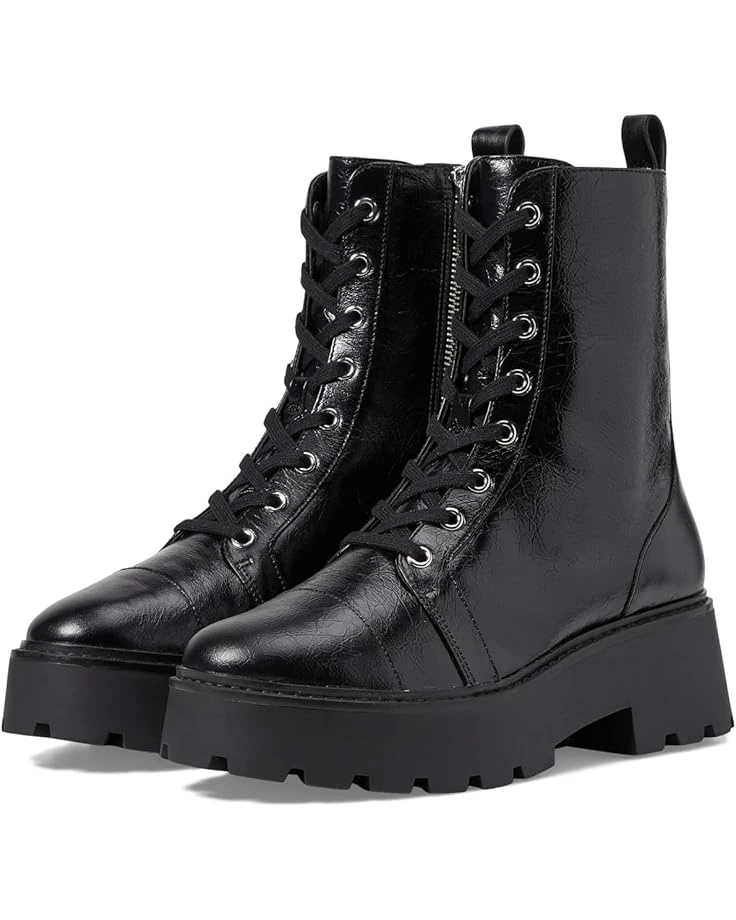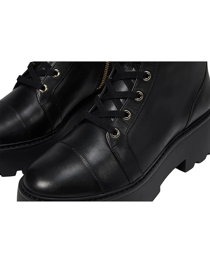 - Combat style lace up bootie with lug sole, has back pull tab and interior zip for easy entry. Crafted from a leather upper, this boot brings all the attitude with a round toe silhouette, polyester lining and faux leather insole.