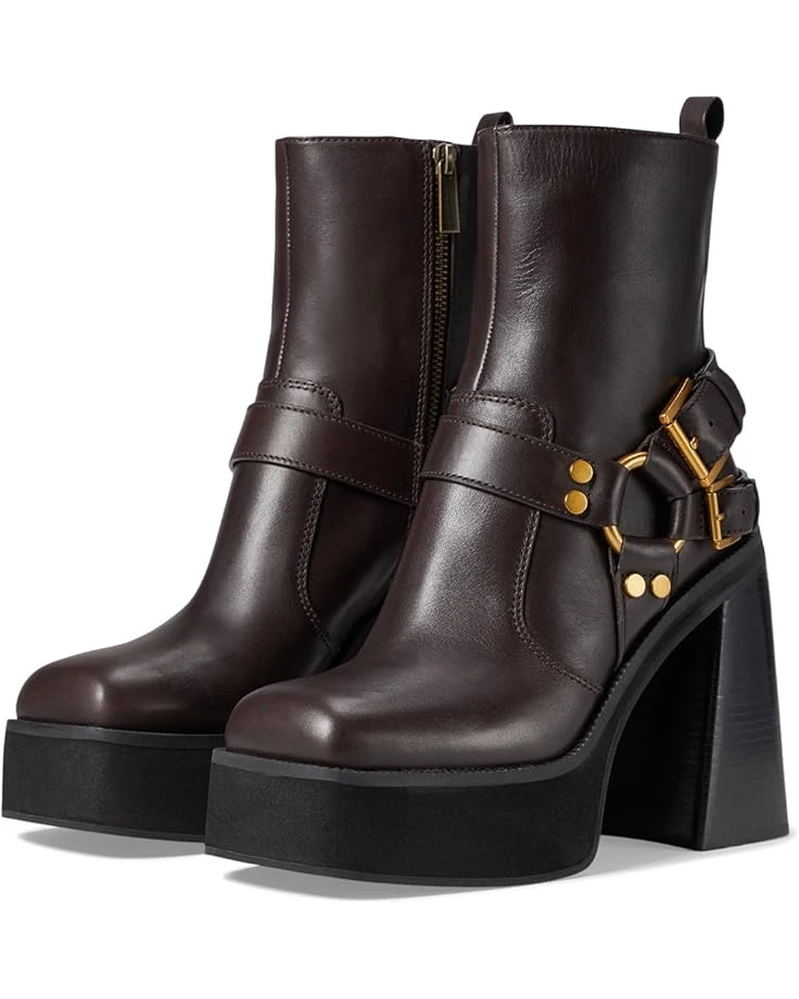 - Inspired by the timeless motorcycle boot featuring modern exaggerated squared toe and sturdy moto hardware for a rugged and edgy attitude. Platform bootie silhouette with full side zipper closure and back pull tab for easy on/off.