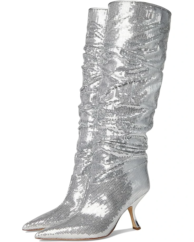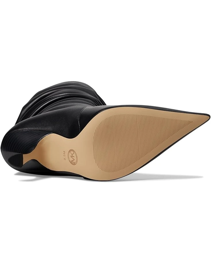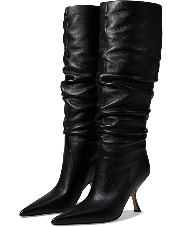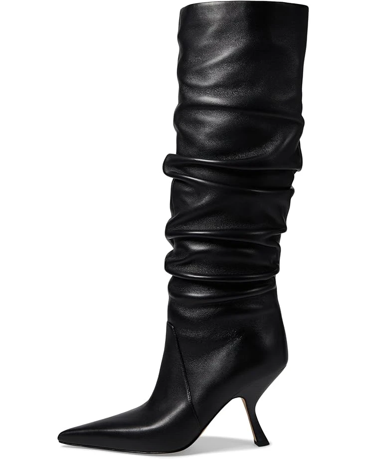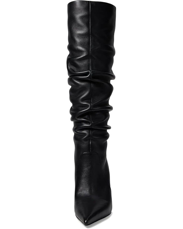- Point toe pull on to-the-knee statement boot with fashionable kicked-in heel design. Satin lining is smooth on the leg and allows for the soft slouch effect.