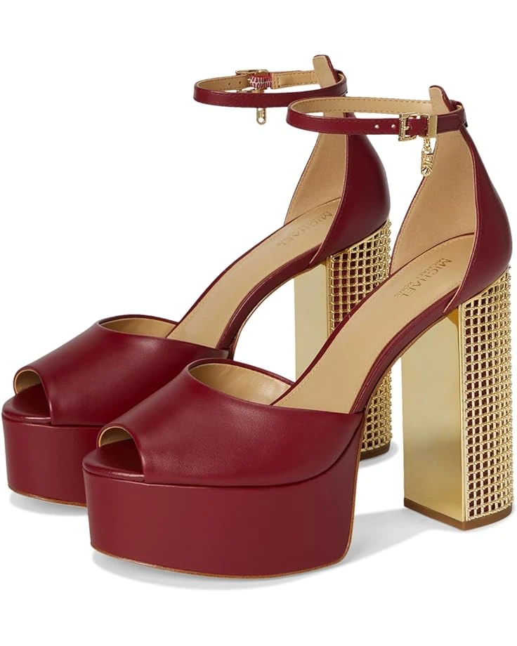 - Exude a chic vibe as you style outfits with the MICHAEL Michael Kors® Maxine Platform Heels. The platform peep toe features a modern design with timeless sophistication and showcases a unique and innovative block heel design inspired by an earring crafted into a cage-like structure that wraps around the heel. The clean and timeless leather uppers paired with this heel with intricate openings create dimension and visual interest, ensuring the heel takes center stage. It features a faux leather lining, ethylene vinyl acetate insole, and an ankle strap & buckle closure.