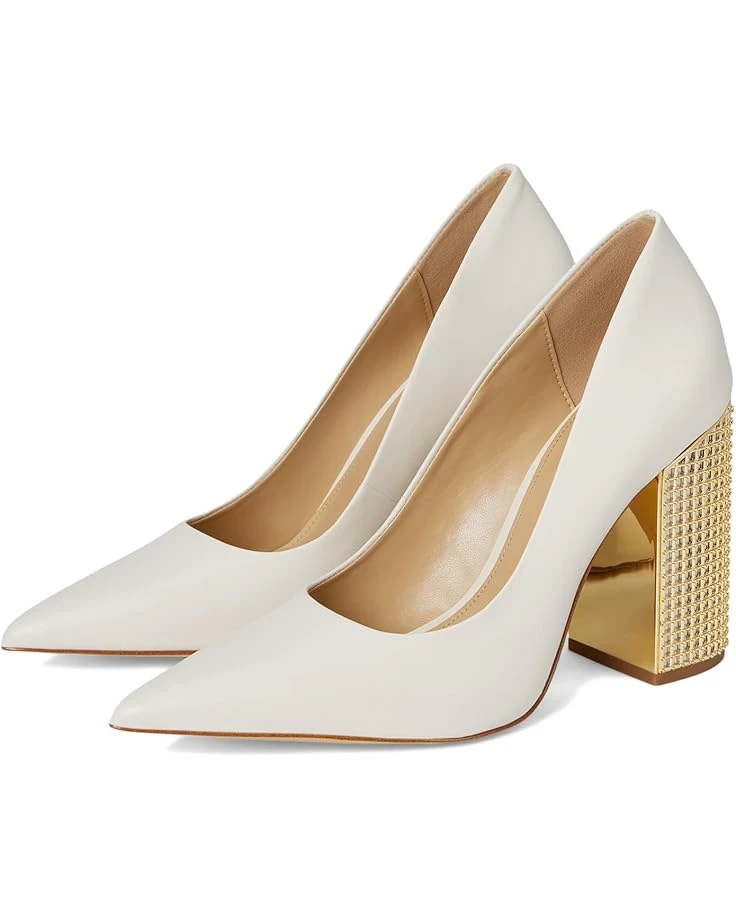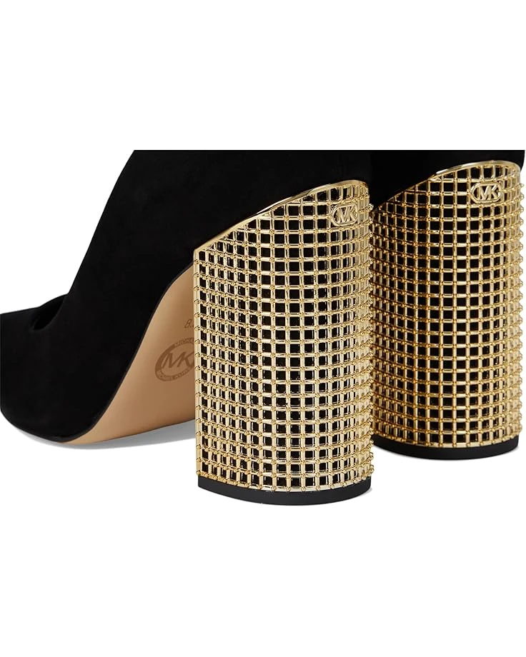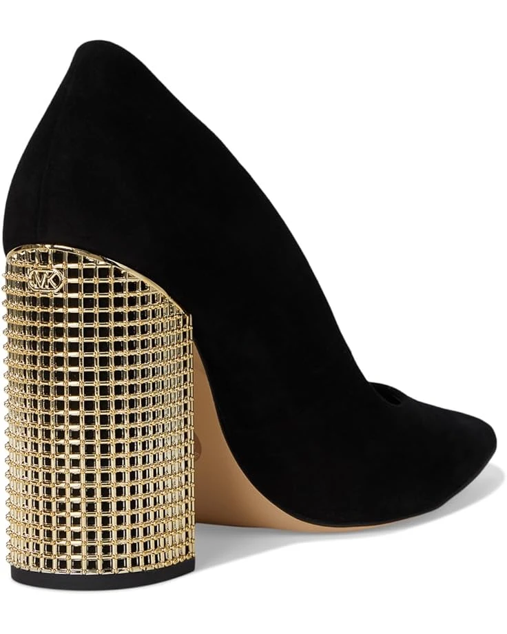 - The MICHAEL Michael Kors® Maxine Pumps: A fusion of modern elegance and innovative design. Crafted with a sleek leather upper and a chic point toe, these slip-on pumps feature a one-of-a-kind block heel inspired by an earring, creating a striking, cage-like structure that wraps the heel. The intricate openings add a dimensional flair, ensuring the heel becomes the star of every outfit. With a comfortable faux leather lining, EVA insole, and durable rubber outsole, these pumps offer both style and comfort, making them the perfect choice for elevating any look from day to night.