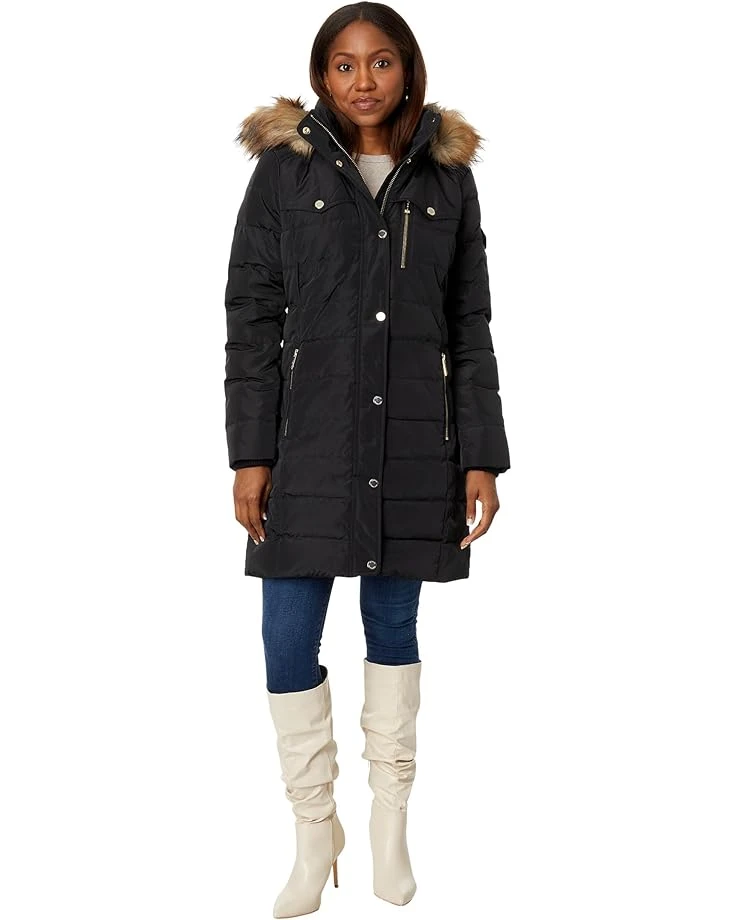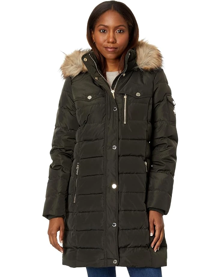 - Brave the cold in style wearing the MICHAEL Michael Kors® Snap Front Down Puffer M825943CZ. This jacket features snap button with zippered closure, two zippered pockets on the front, Zippered pocket on the left chest, and long sleeves with elasticized cuffs. It has faux fur attached hood, and long sleeves with elasticized cuffs.